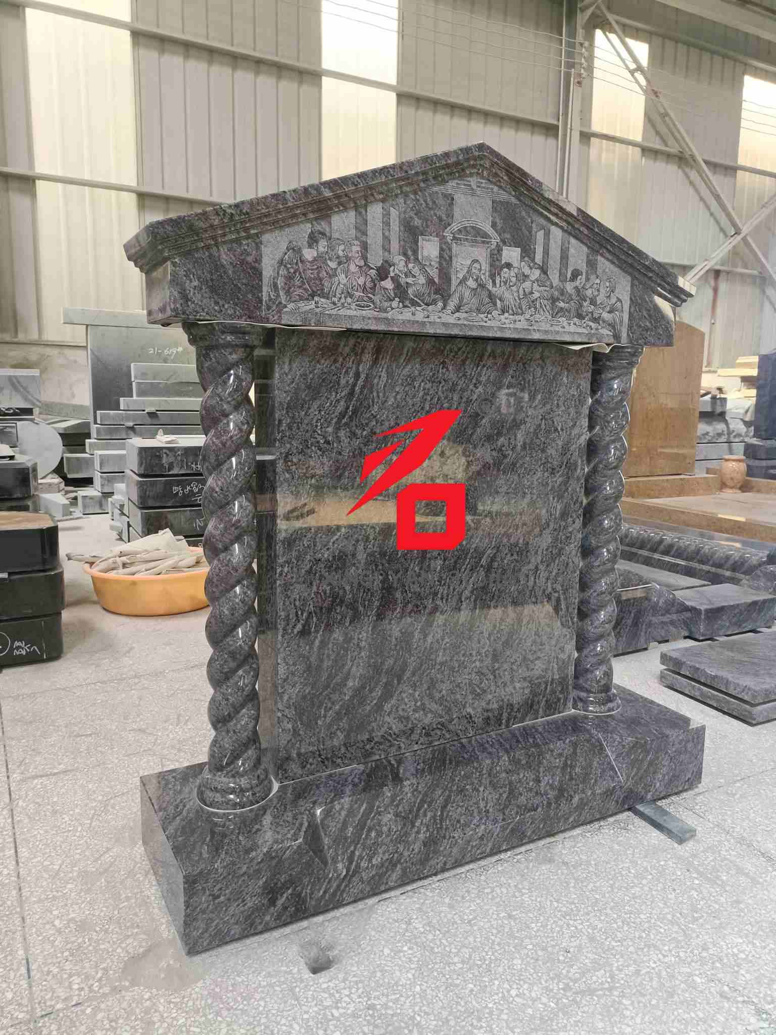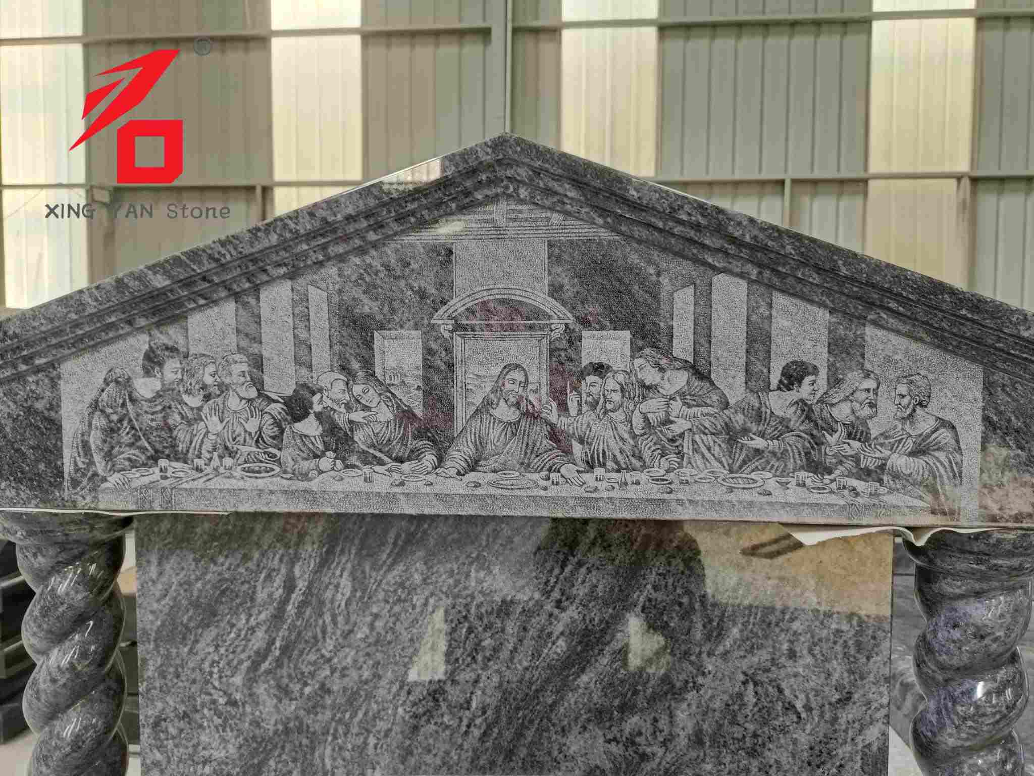 デザイン:全体的なデザインはヨーロッパの建築様式を表しています。上部は古典的なコーニス構造が特徴で、前面には古典的な宗教場面「最後の晩餐」のレリーフが彫られています。ねじれた柱が側面を飾り、柱には明確で立体的な螺旋模様が描かれており、宗教文化と建築芸術が巧みに融合しています。デザインは荘厳で芸術的に魅力的です。